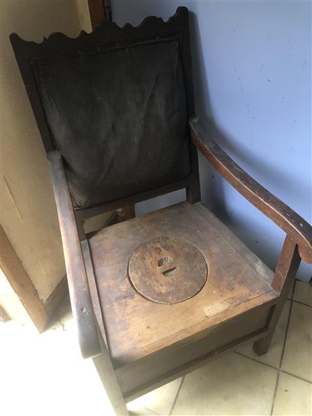 19de eeuwse antieke houten armstoel - gemakstoel bekleed met leder, afkomstig van oude hoeve.